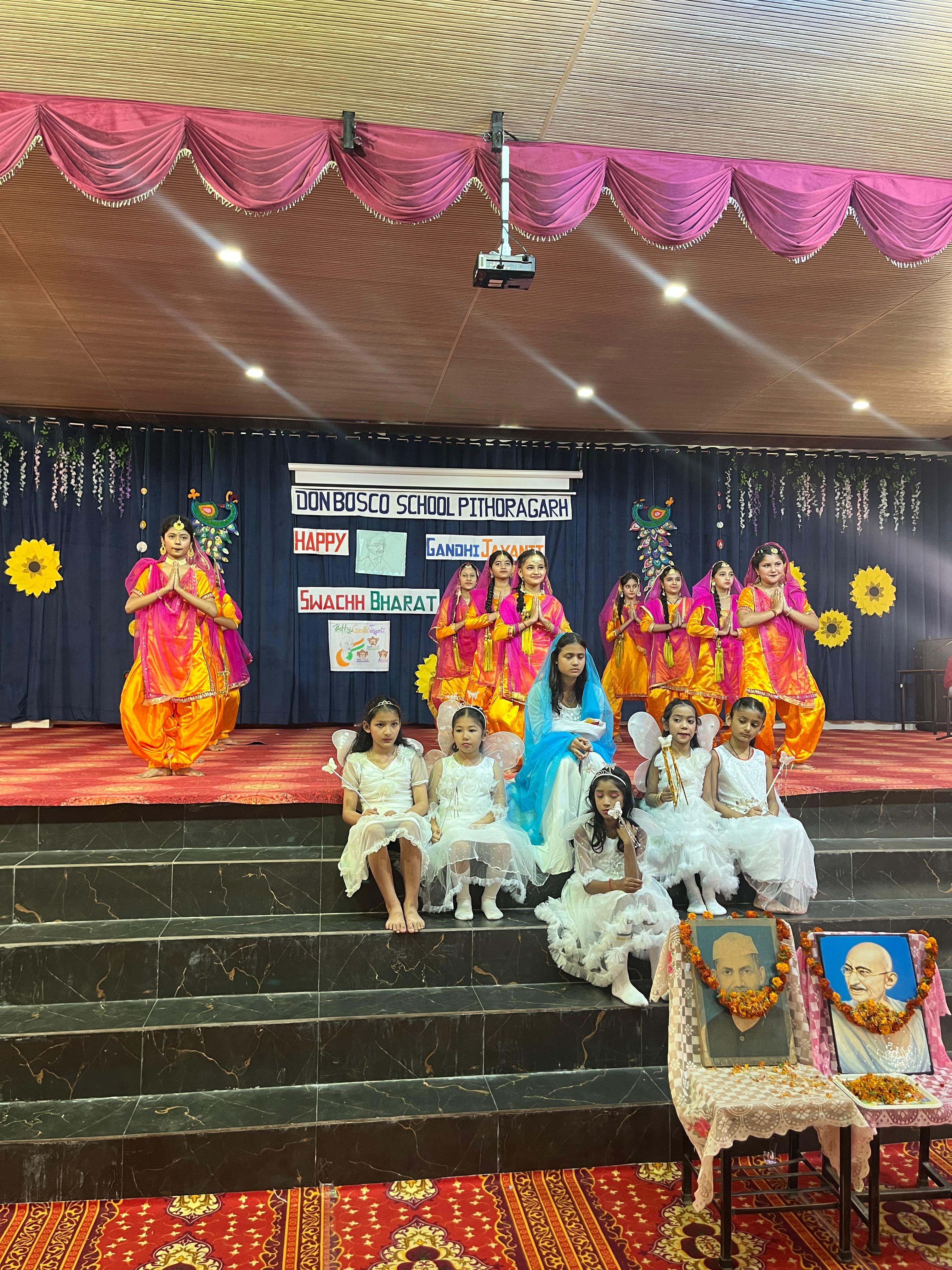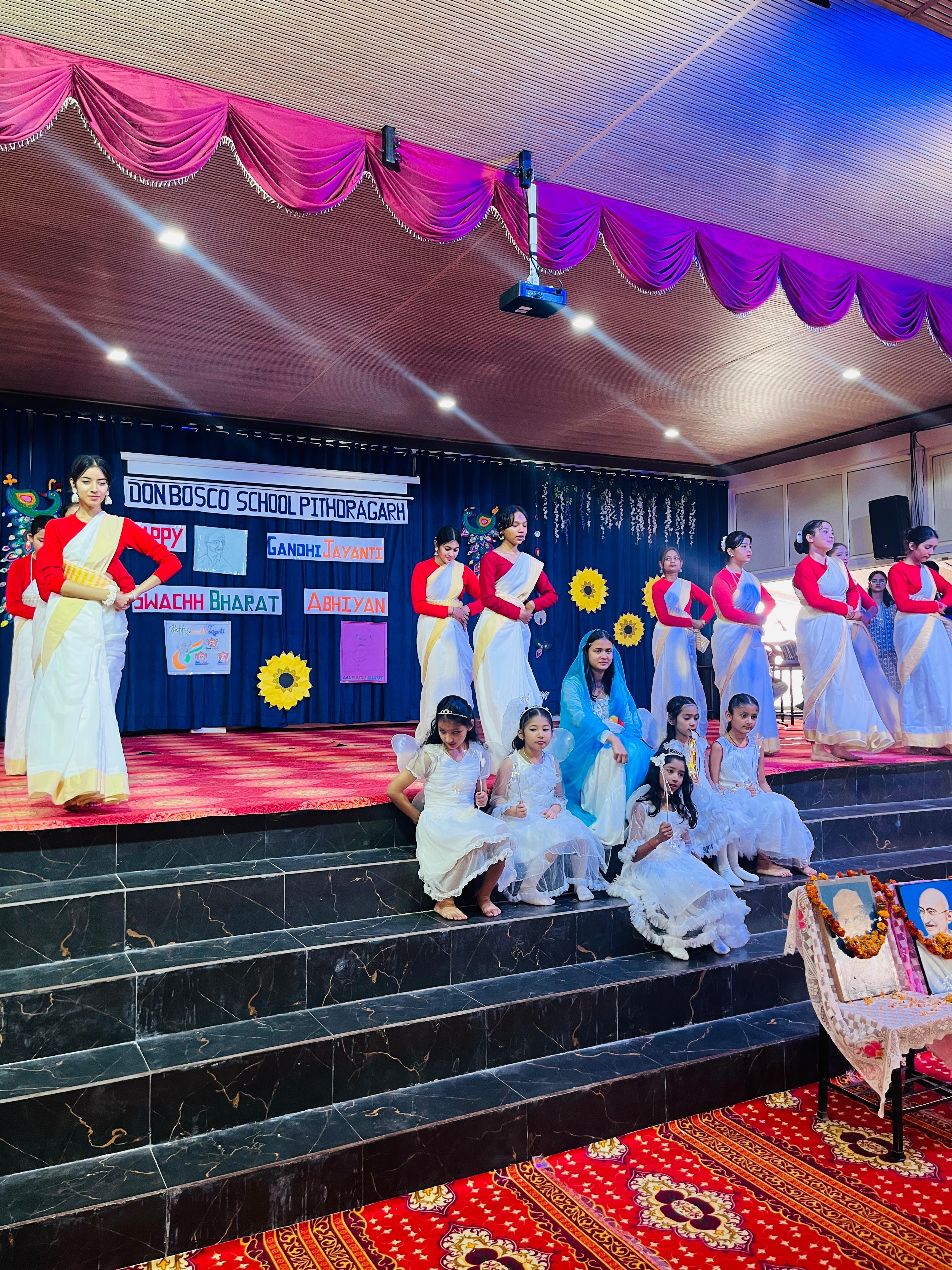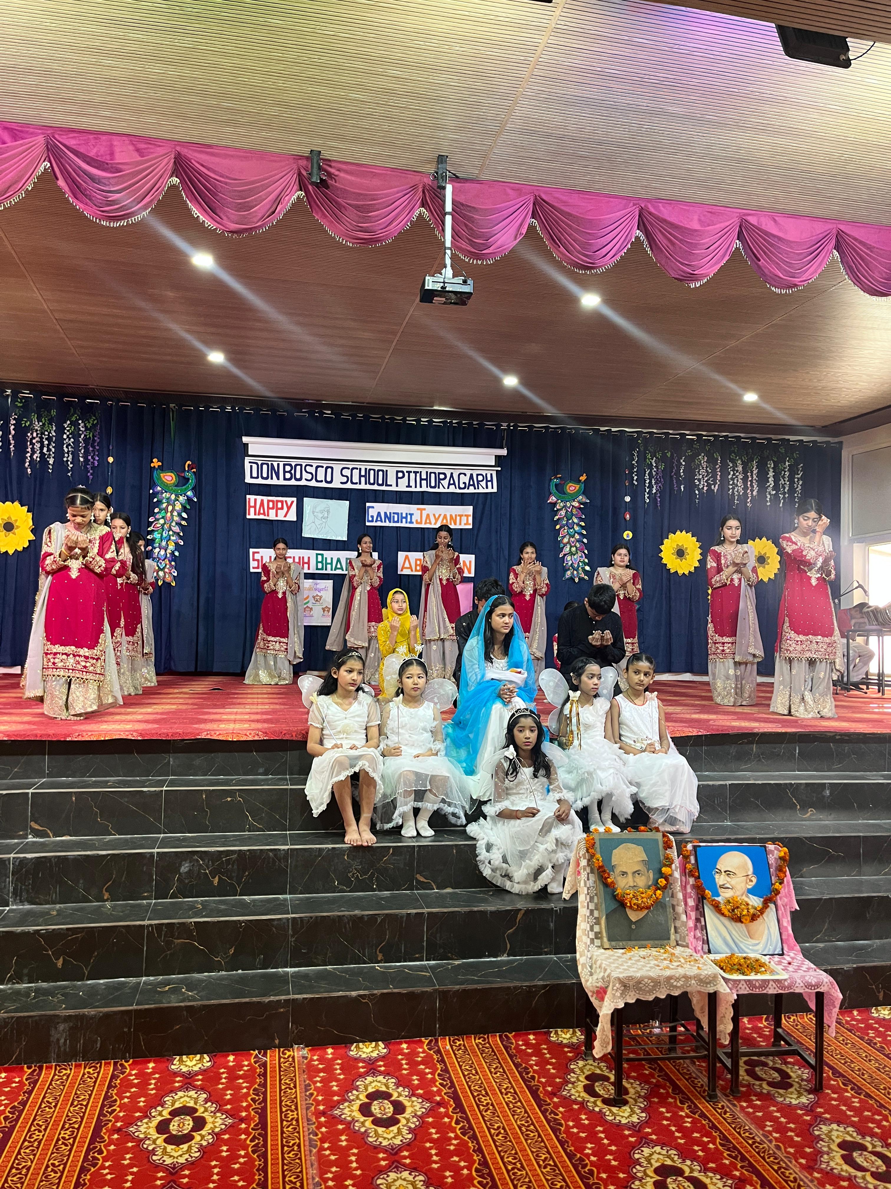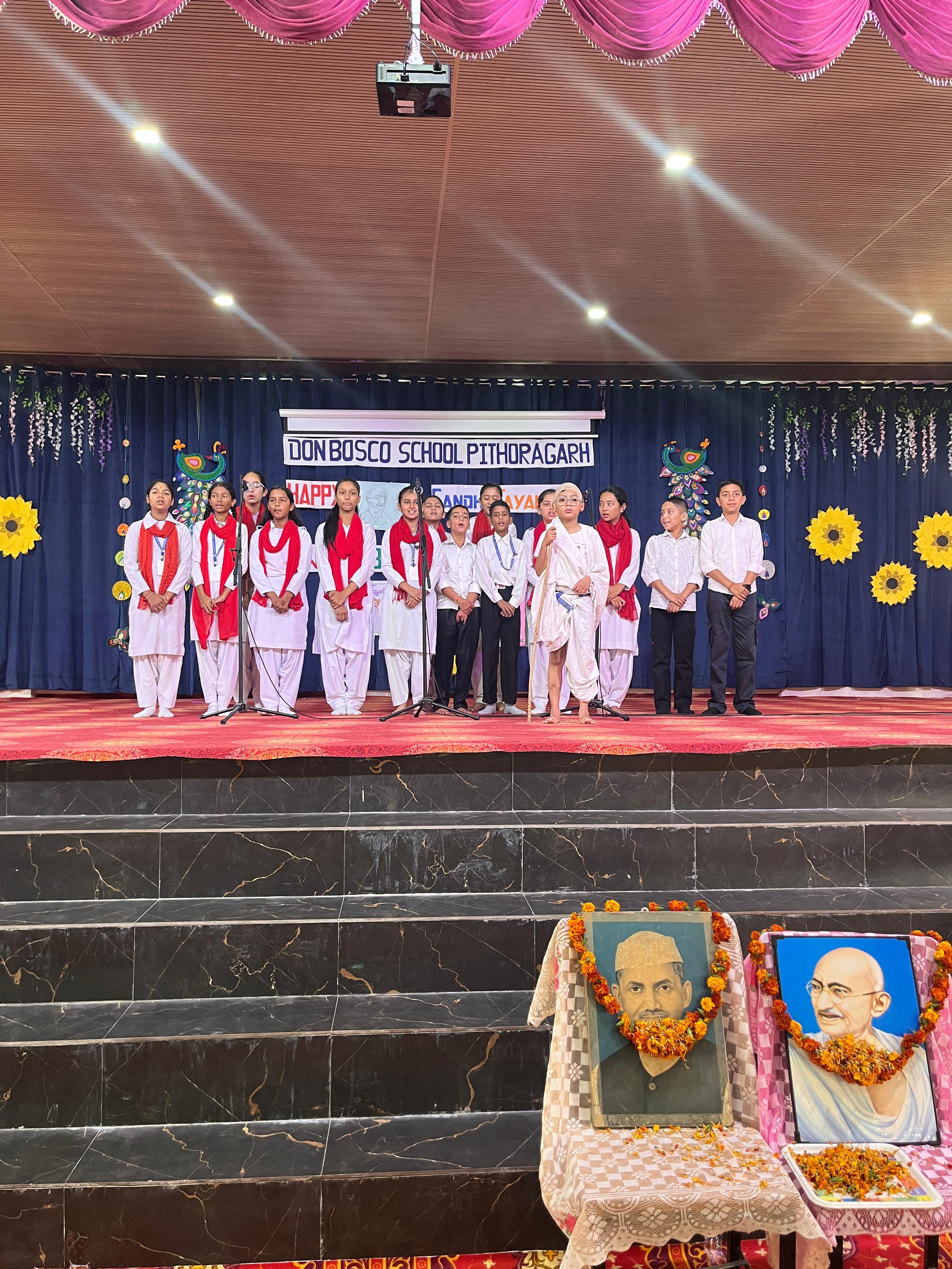 Description : Gandhi Jayanti and Lal Bahadur Shastri Jayanti Celebration at Don Bosco School Don Bosco School celebrated the birth anniversaries of Mahatma Gandhi and Lal Bahadur Shastri with great enthusiasm and patriotic spirit. The event commenced with the hoisting of the national flag, followed by a disciplined march past by the students. People from various religions were invited to the celebration, and they shared messages of peace, unity, and love with the students. Inspirational stories and teachings from the lives of Mahatma Gandhi and Lal Bahadur Shastri were shared to highlight their immense contributions to the nation. A ceremonial lamp was lit to inaugurate the cultural program. Patriotic songs were sung, and students presented various performances that showcased India’s rich Sanskriti (cultural) heritage. The celebration effectively conveyed the values of truth, non-violence, simplicity, and national pride.