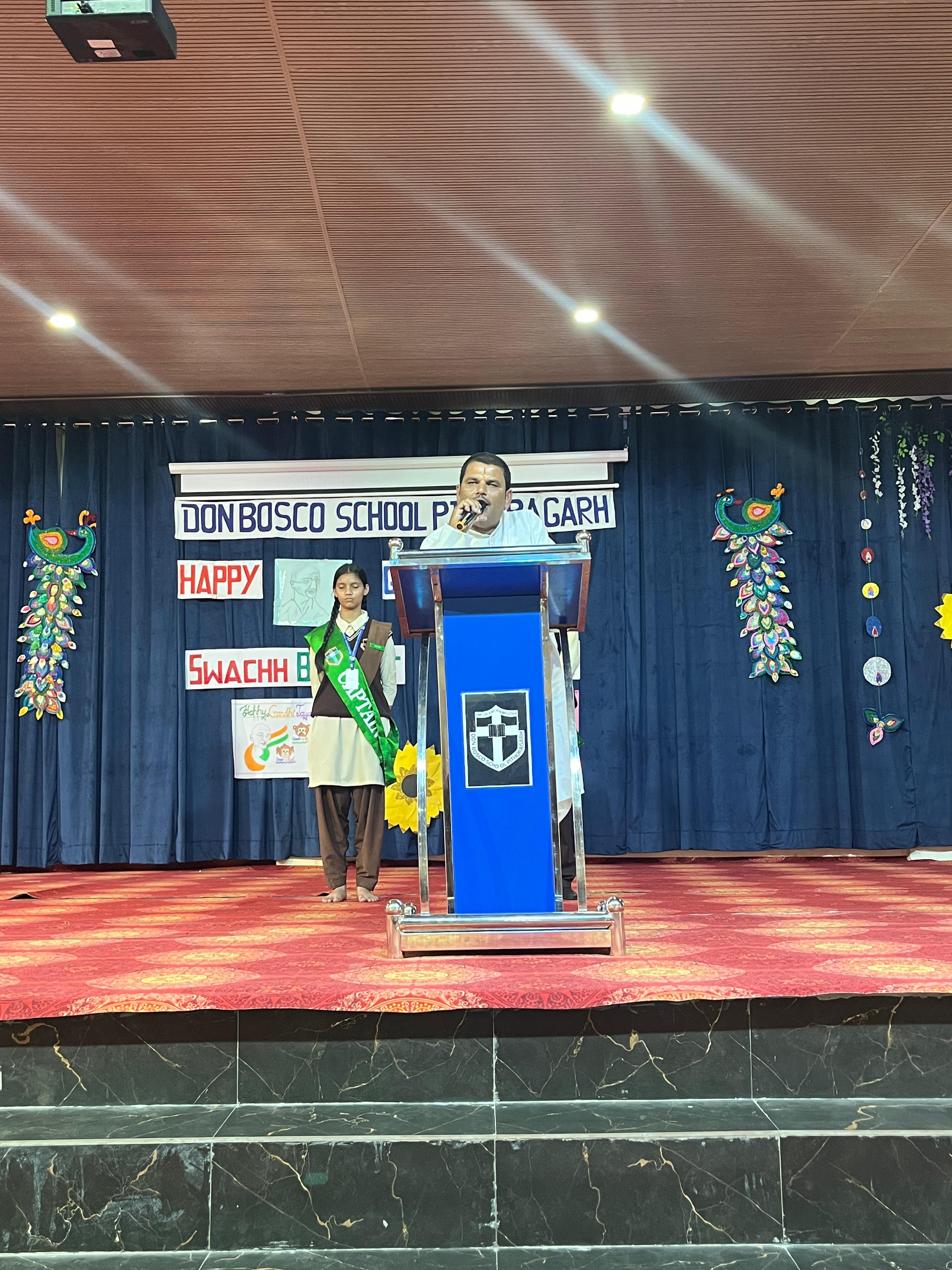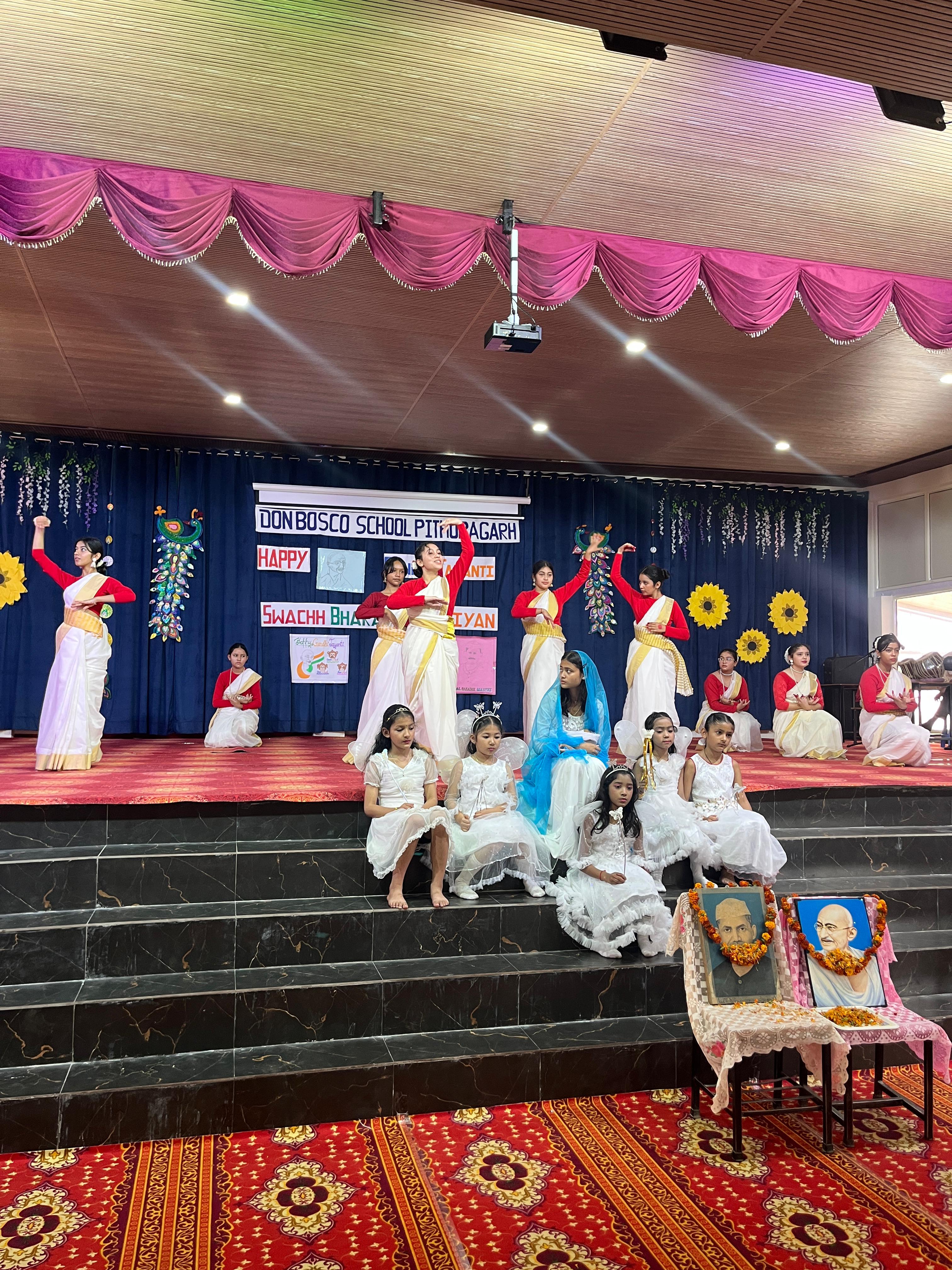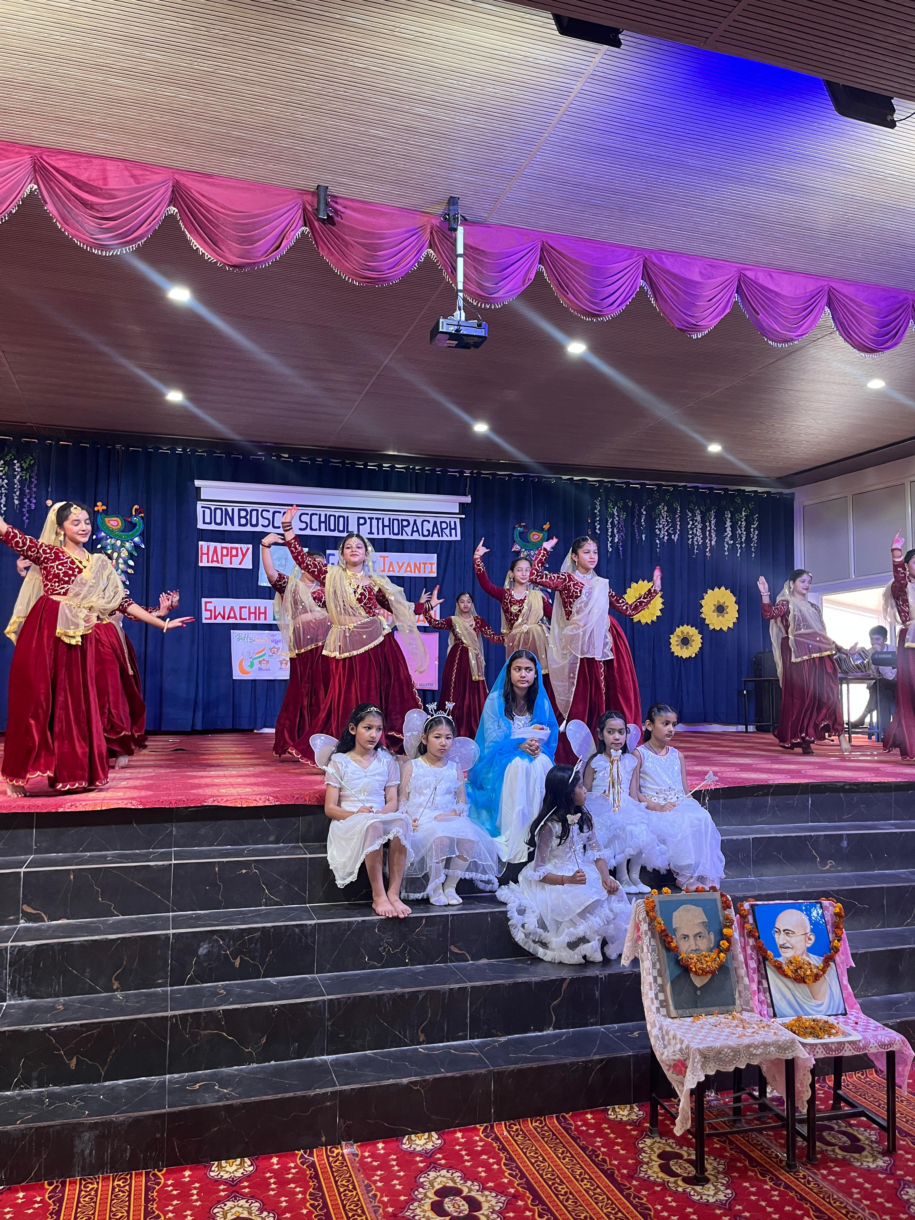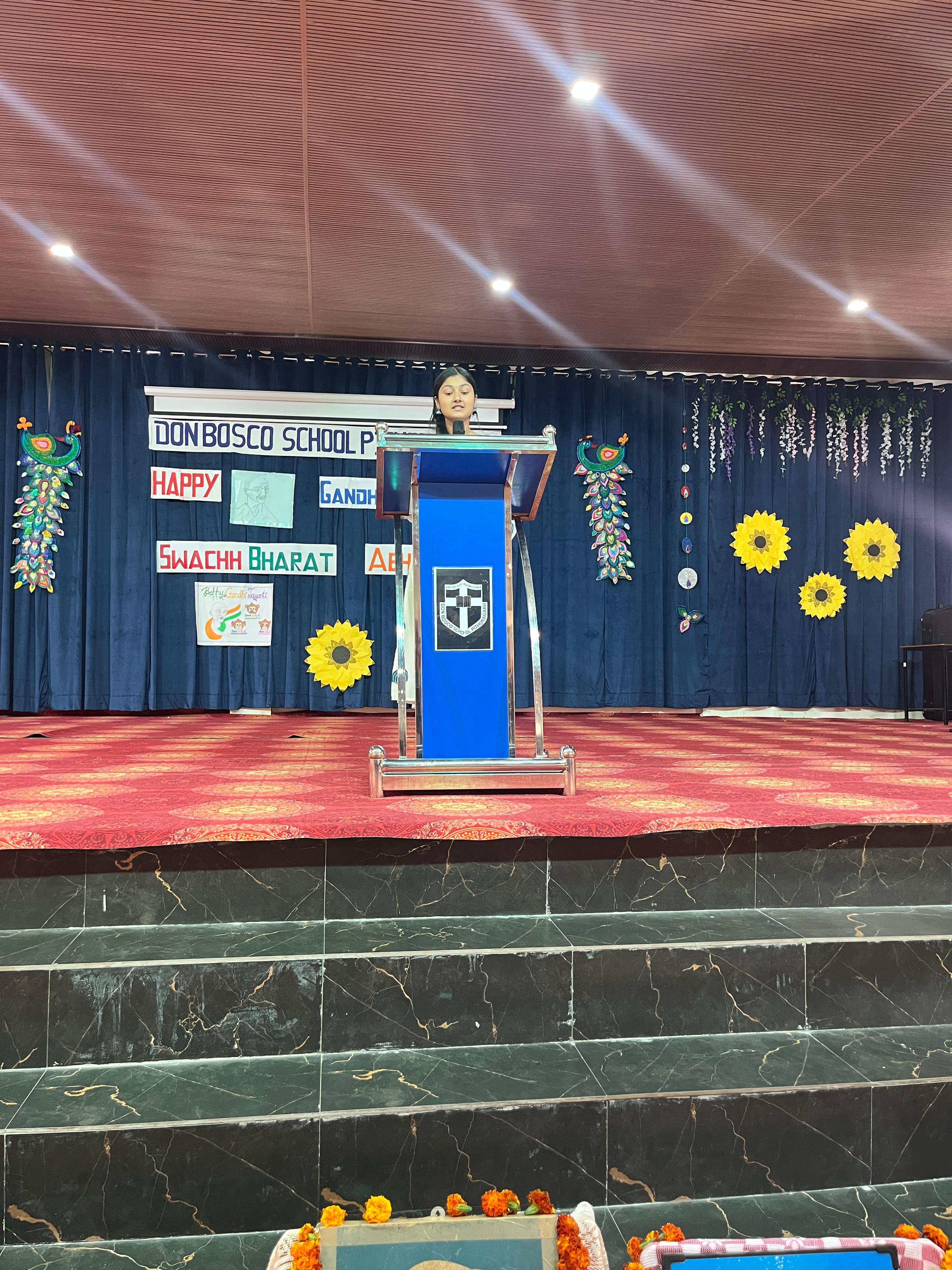 Description : Gandhi Jayanti and Lal Bahadur Shastri Jayanti Celebration at Don Bosco School Don Bosco School celebrated the birth anniversaries of Mahatma Gandhi and Lal Bahadur Shastri with great enthusiasm and patriotic spirit. The event commenced with the hoisting of the national flag, followed by a disciplined march past by the students. People from various religions were invited to the celebration, and they shared messages of peace, unity, and love with the students. Inspirational stories and teachings from the lives of Mahatma Gandhi and Lal Bahadur Shastri were shared to highlight their immense contributions to the nation. A ceremonial lamp was lit to inaugurate the cultural program. Patriotic songs were sung, and students presented various performances that showcased India’s rich Sanskriti (cultural) heritage. The celebration effectively conveyed the values of truth, non-violence, simplicity, and national pride.