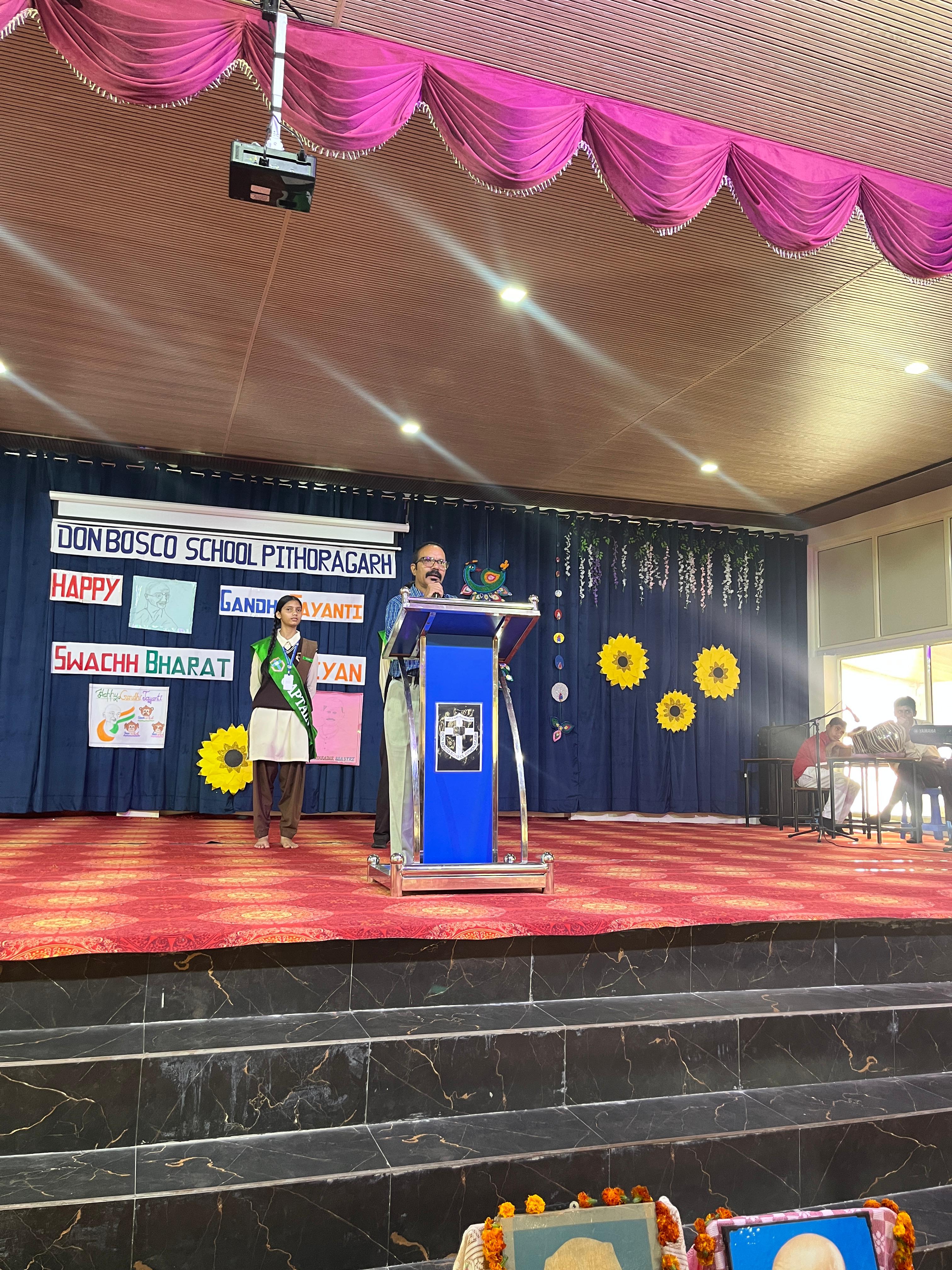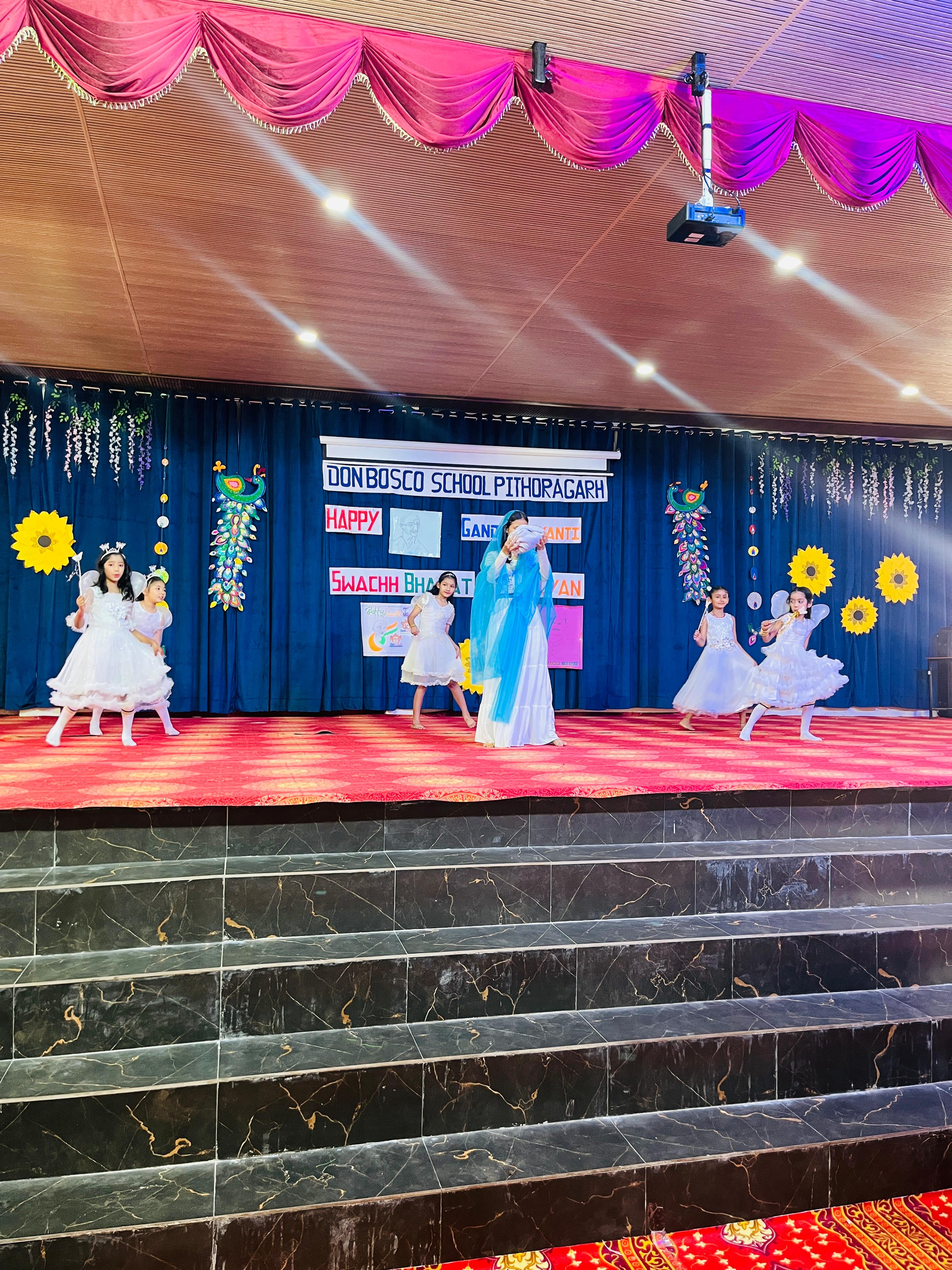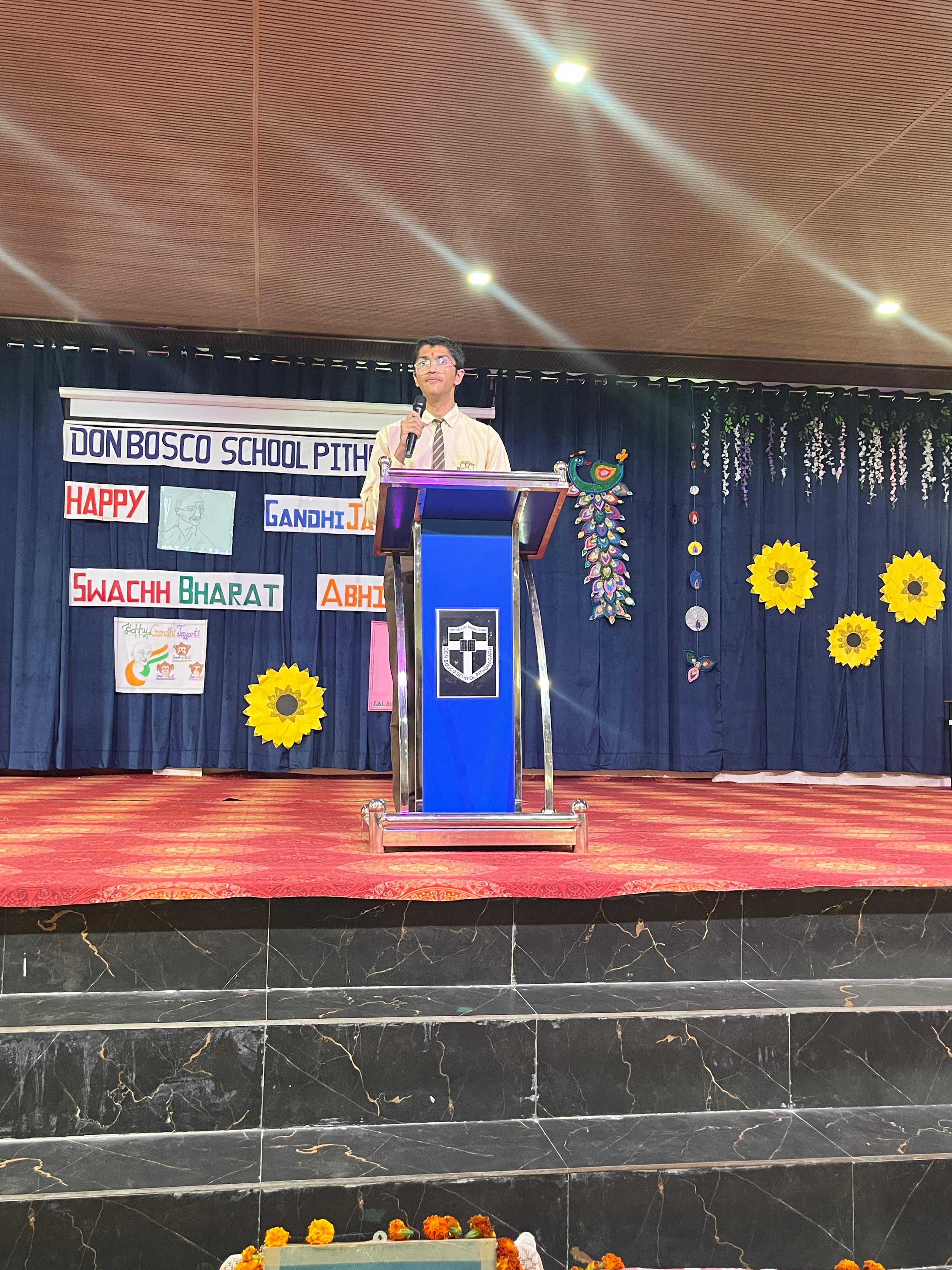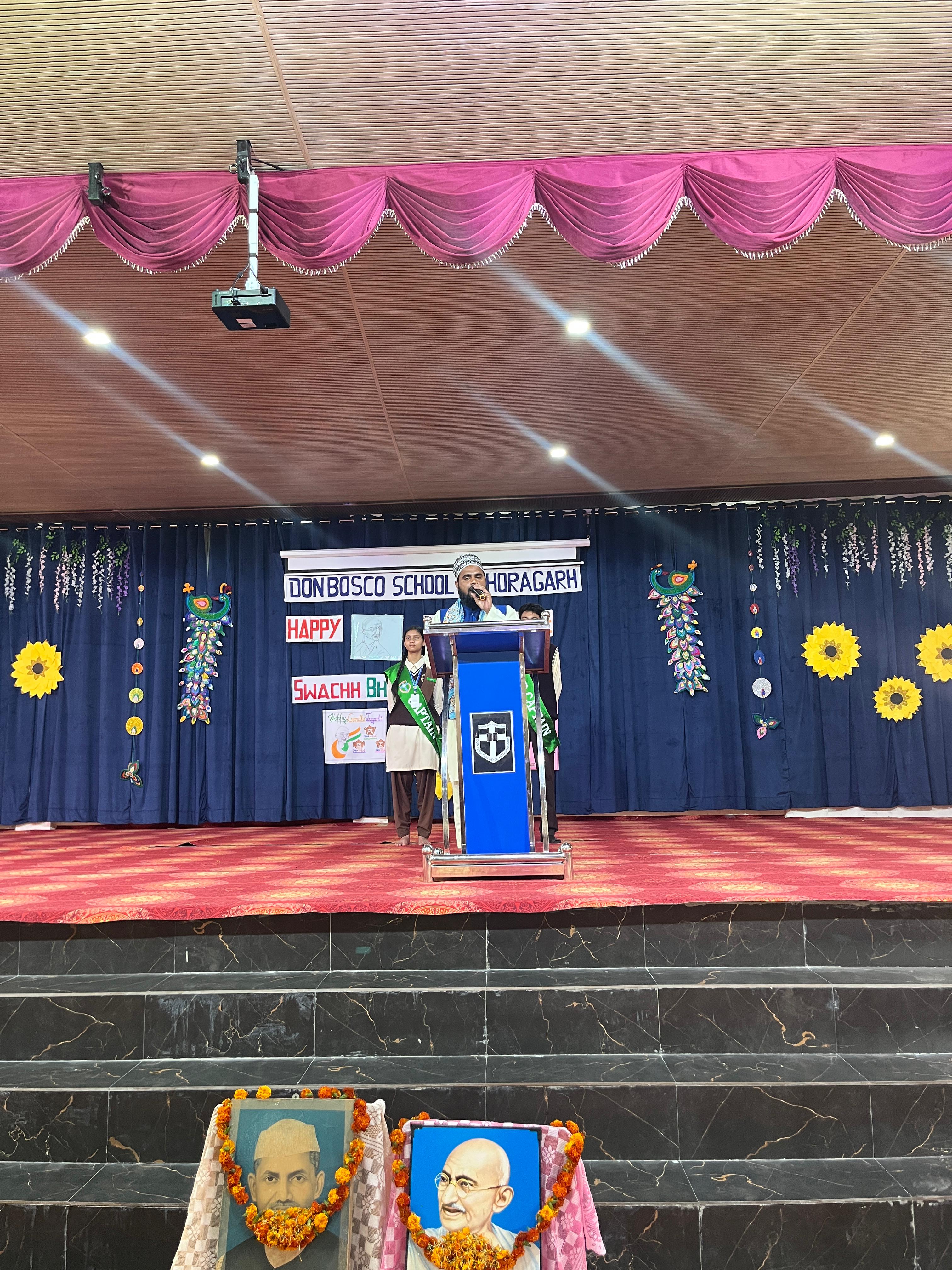 Description : Gandhi Jayanti and Lal Bahadur Shastri Jayanti Celebration at Don Bosco School Don Bosco School celebrated the birth anniversaries of Mahatma Gandhi and Lal Bahadur Shastri with great enthusiasm and patriotic spirit. The event commenced with the hoisting of the national flag, followed by a disciplined march past by the students. People from various religions were invited to the celebration, and they shared messages of peace, unity, and love with the students. Inspirational stories and teachings from the lives of Mahatma Gandhi and Lal Bahadur Shastri were shared to highlight their immense contributions to the nation. A ceremonial lamp was lit to inaugurate the cultural program. Patriotic songs were sung, and students presented various performances that showcased India’s rich Sanskriti (cultural) heritage. The celebration effectively conveyed the values of truth, non-violence, simplicity, and national pride.