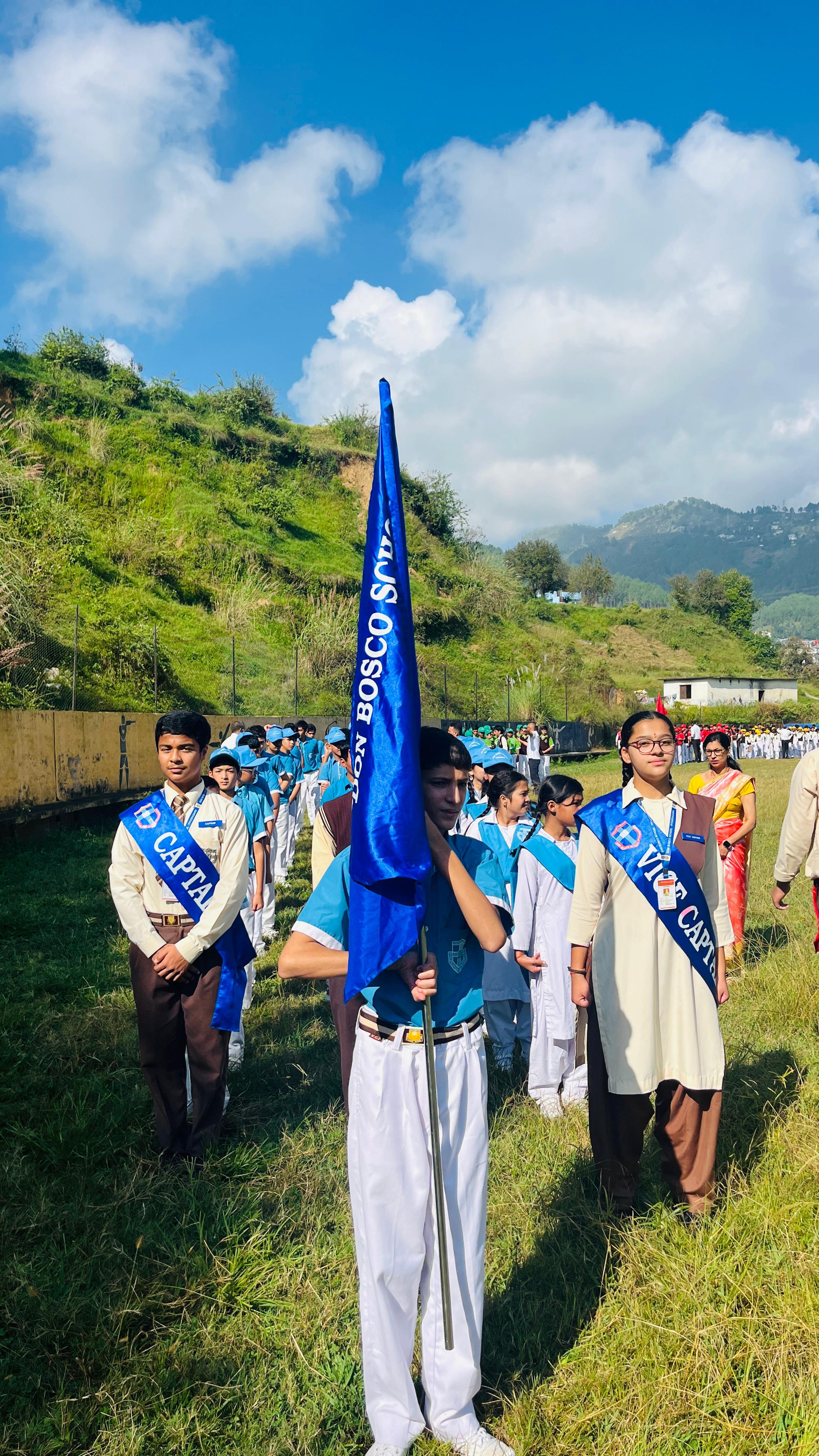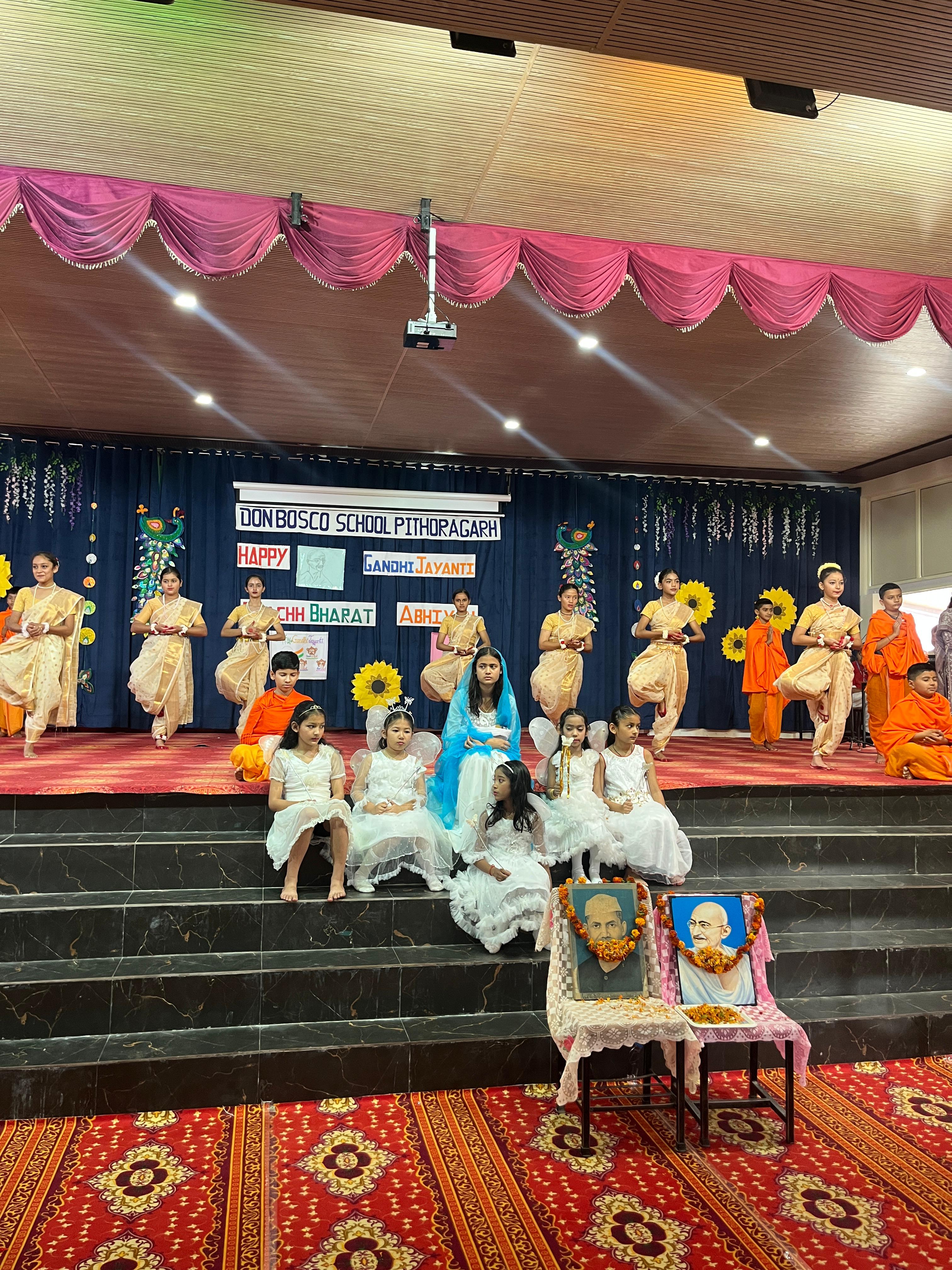 Description : Gandhi Jayanti and Lal Bahadur Shastri Jayanti Celebration at Don Bosco School Don Bosco School celebrated the birth anniversaries of Mahatma Gandhi and Lal Bahadur Shastri with great enthusiasm and patriotic spirit. The event commenced with the hoisting of the national flag, followed by a disciplined march past by the students. People from various religions were invited to the celebration, and they shared messages of peace, unity, and love with the students. Inspirational stories and teachings from the lives of Mahatma Gandhi and Lal Bahadur Shastri were shared to highlight their immense contributions to the nation. A ceremonial lamp was lit to inaugurate the cultural program. Patriotic songs were sung, and students presented various performances that showcased India’s rich Sanskriti (cultural) heritage. The celebration effectively conveyed the values of truth, non-violence, simplicity, and national pride.